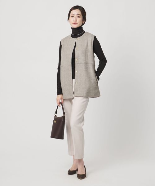 タートルネックや華やかな襟周りのデザインブラウスと合わせるのがおすすめ。