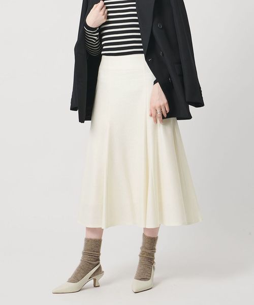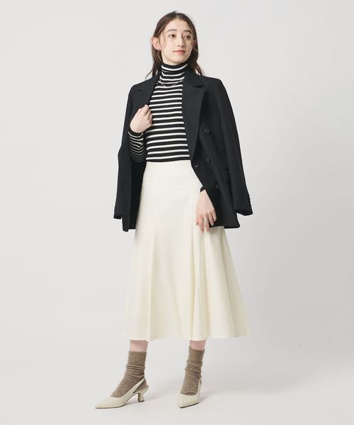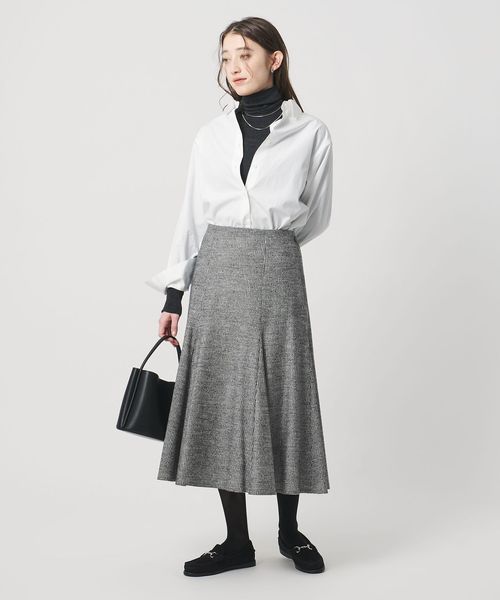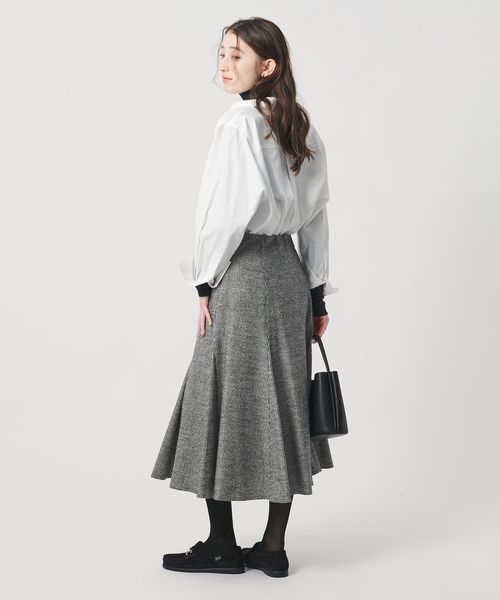 裾にたっぷりと広がりがあるため、コンパクトなリブニットなどと合わせるとバランスよくまとまります。