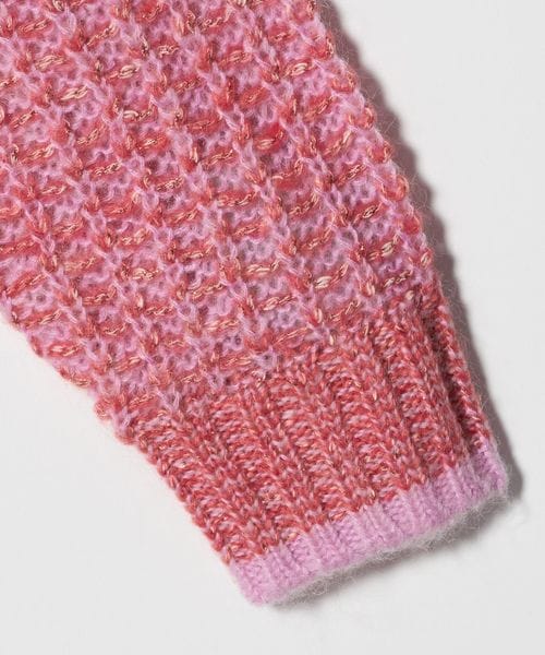 モヘヤ混のやわらかな素材をベースに、ラメ入りのファンシーヤーンを横糸に挿入したインレー編み。