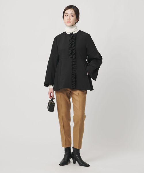 前端にあしらったフリルが華やかで女性らしい印象のミドル丈コート。