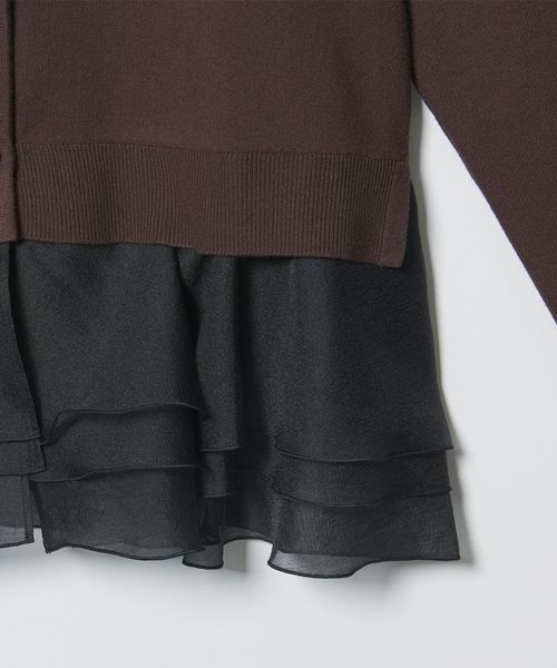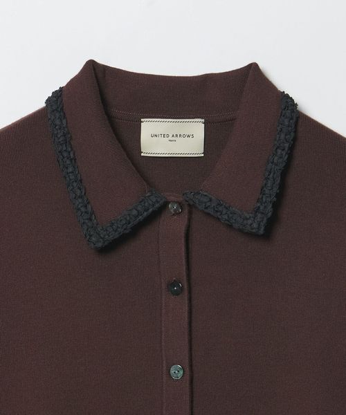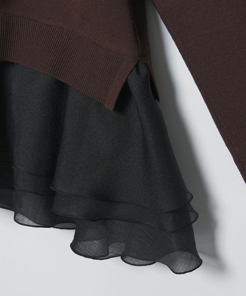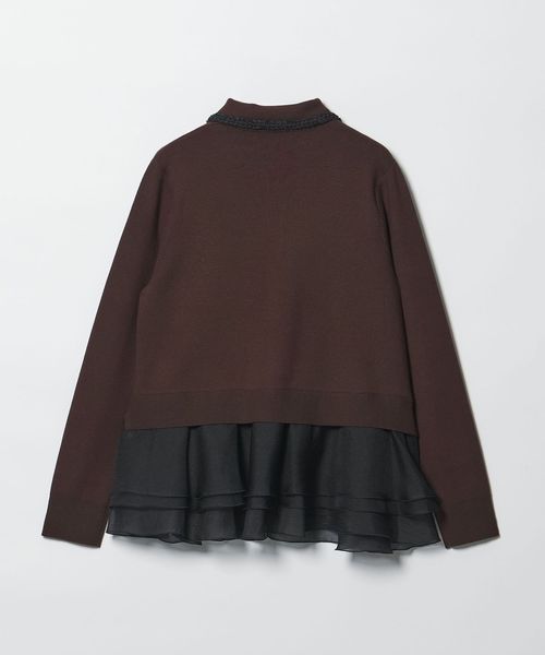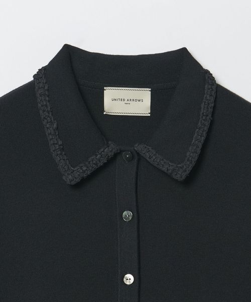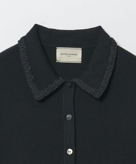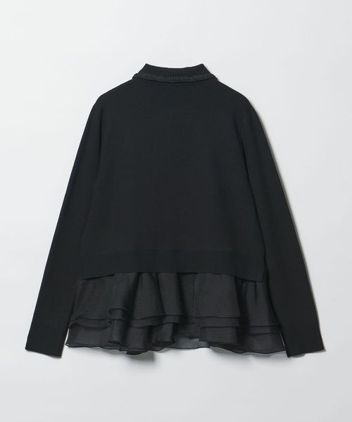 裾周りにあしらった3段ラッフルフリルと、襟元のかぎ針テープが目を惹く、華やかで品のある襟付きニットトップス。
