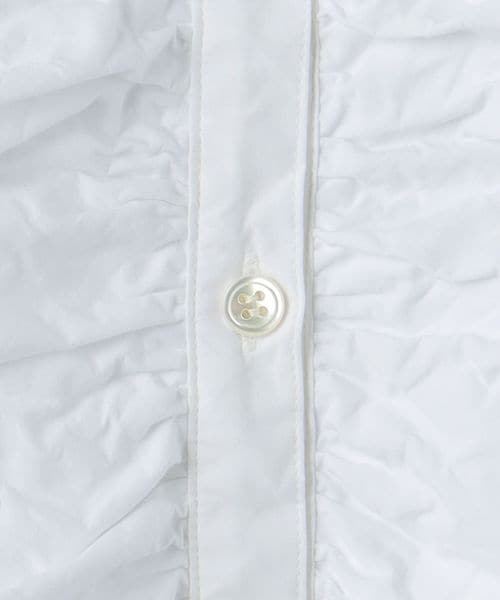襟、袖口、前立てに共布のフリルを飾り、一枚で着映えのするブラウス。