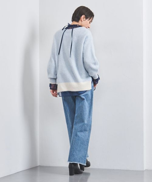 襟元にデザインのあるブラウスとのレイヤードスタイルもおすすめです。