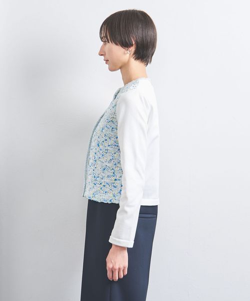 前身頃の立体感のあるミックスツイード編地が華やかな印象のニットカーディガン。