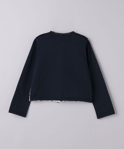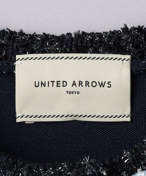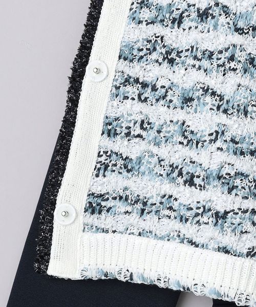 前身頃にはかすりミックスカラー糸やラメフリンジヤーンなど様々な色や形状の糸をミックスした立体感のあるツイード編地。
