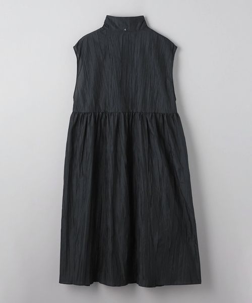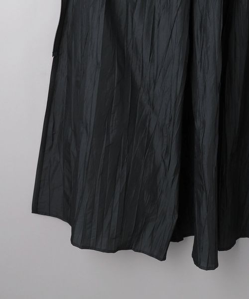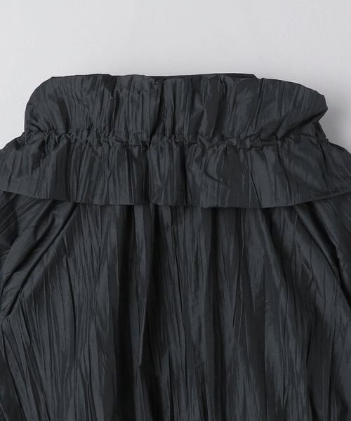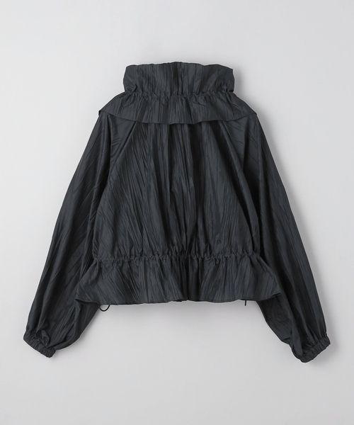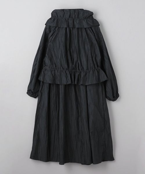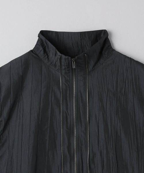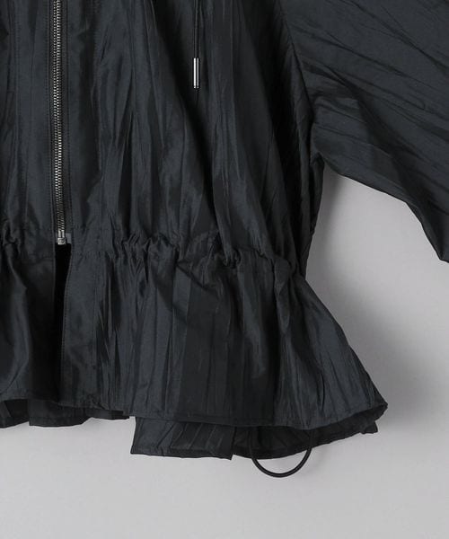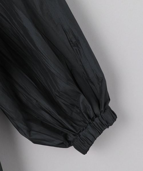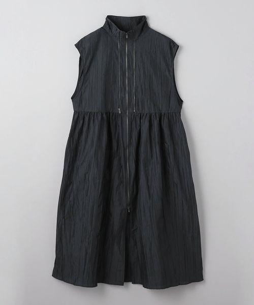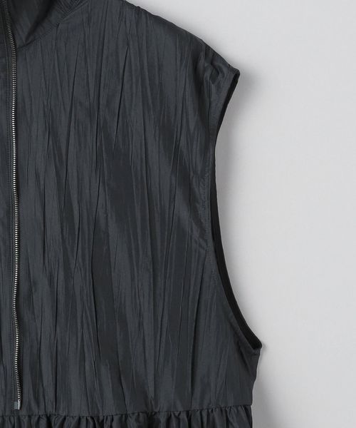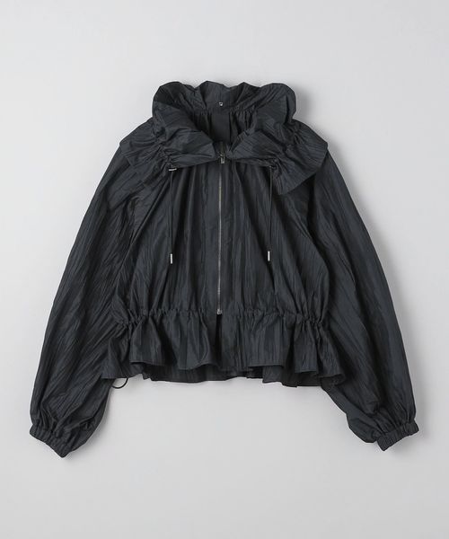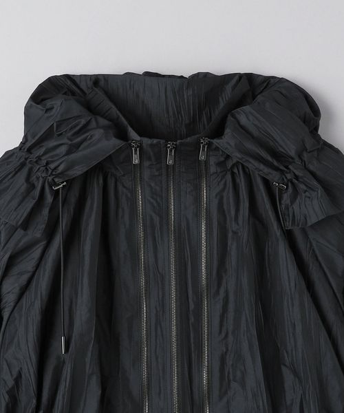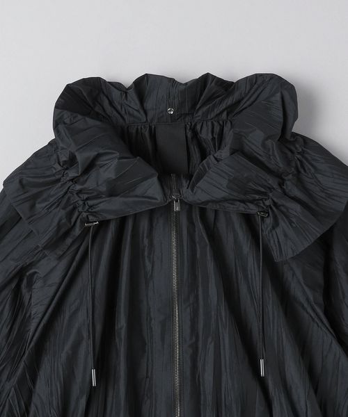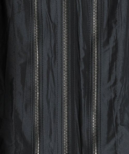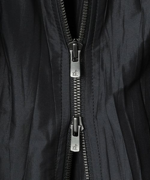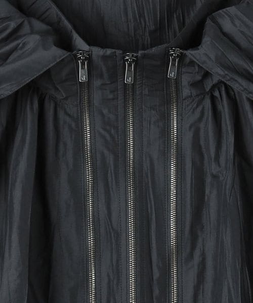 袖と襟にボリュームを持たせたショートブルゾンとハイネックのロングベストがフロントファスナーでドッキングしたデザイン。