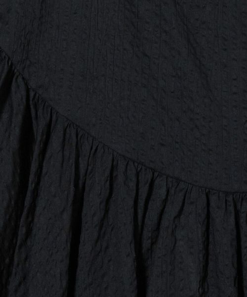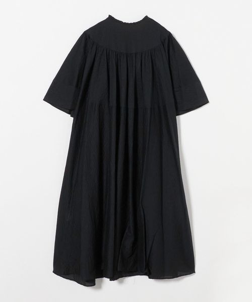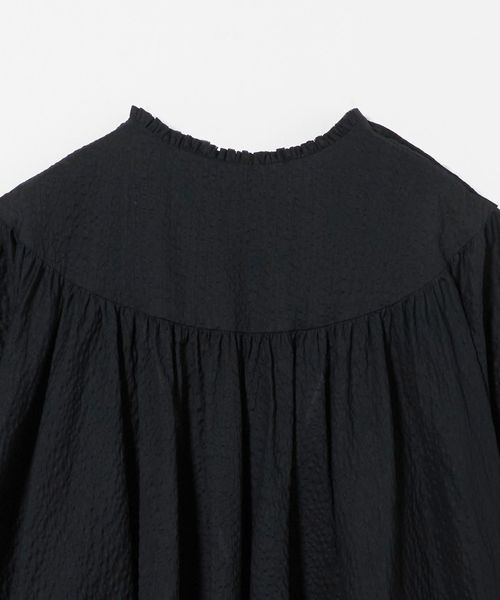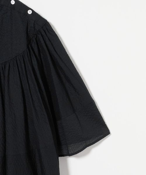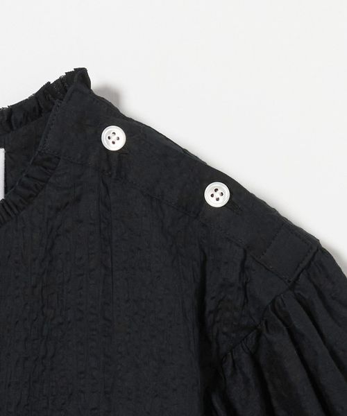 前後のヨーク部分のギャザーやネック周りに施された細かなフリル、肩のボタンもさりげなくポイントになっています。