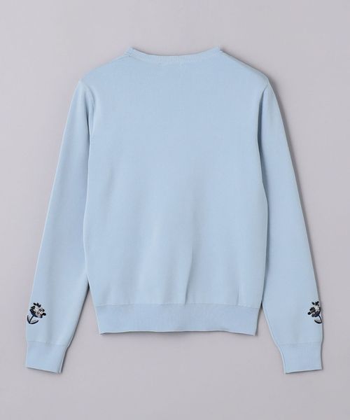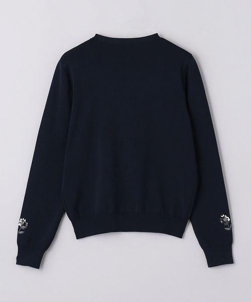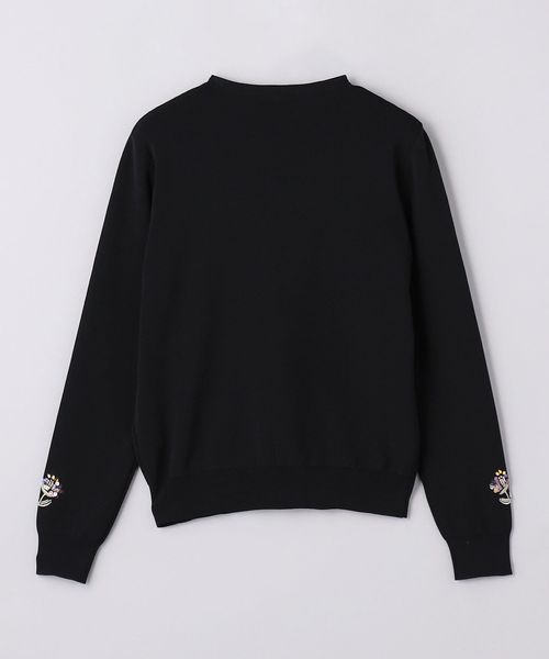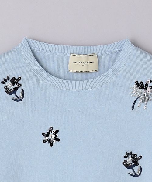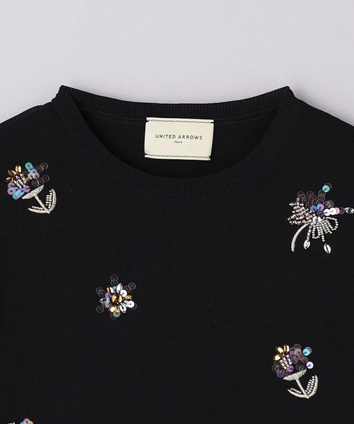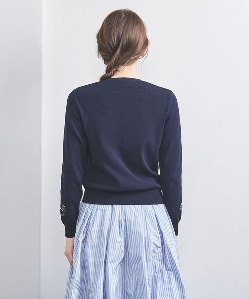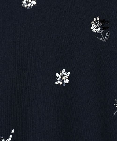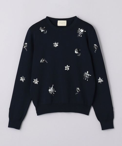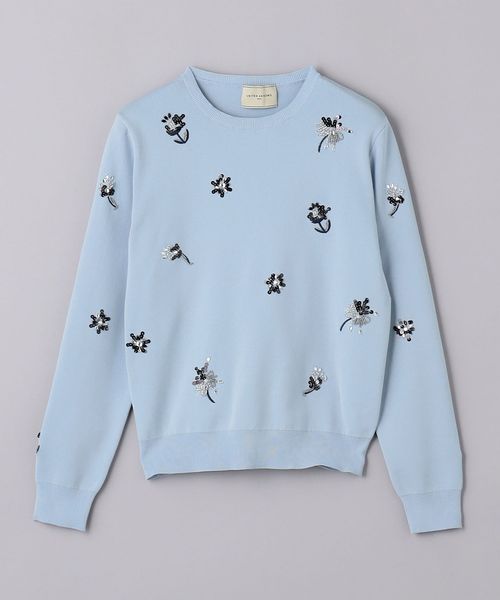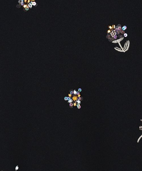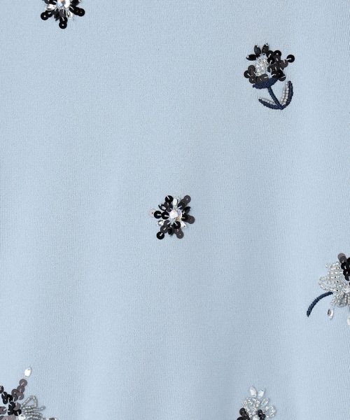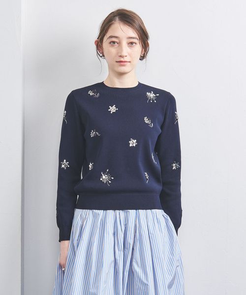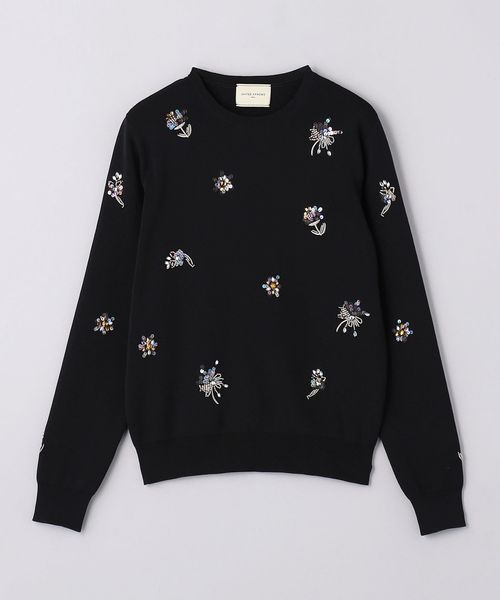 ビーズやビジューであしらったフラワーモチーフを前身頃全体にちりばめた華やかで上品な印象のニット。