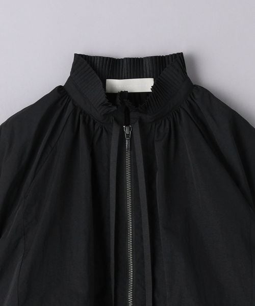 プリーツ加工を施した襟元や袖口のシャーリングデザインが女性らしいディテール。