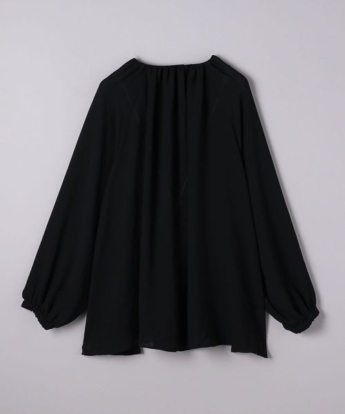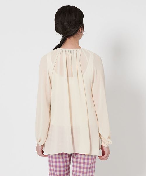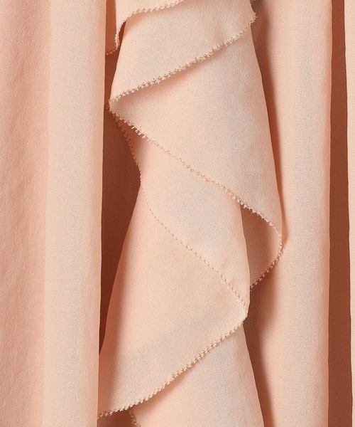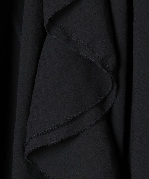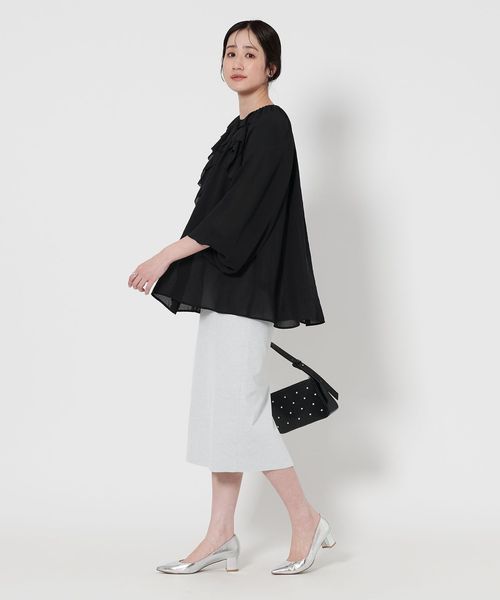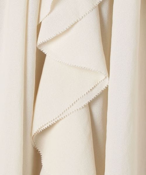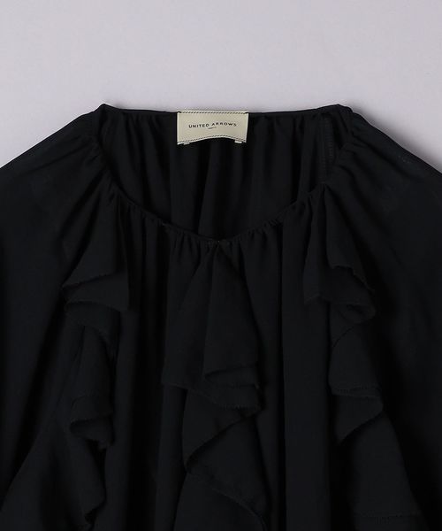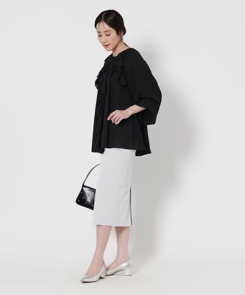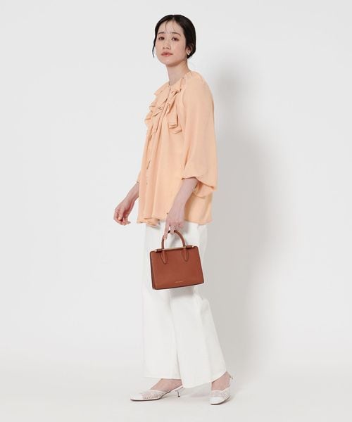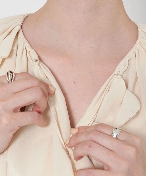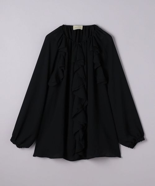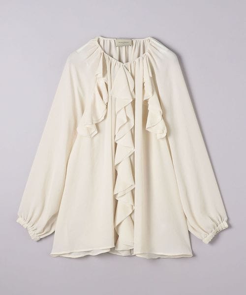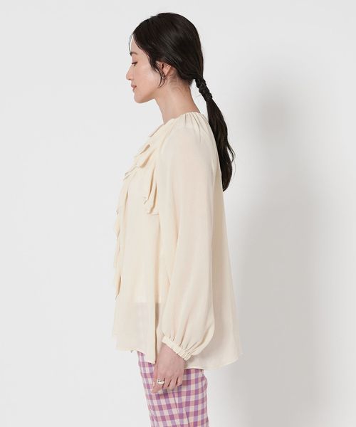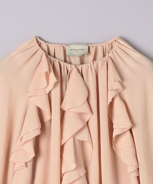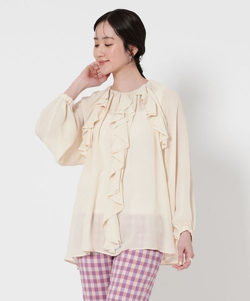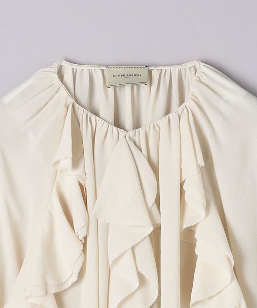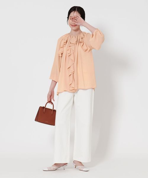 分量感のあるラッフルフリルが印象的で女性らしいノーカラーブラウス。
