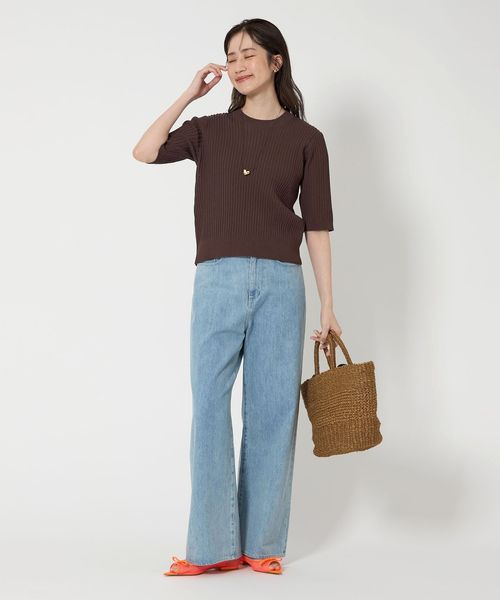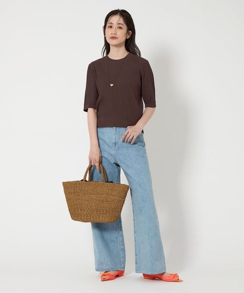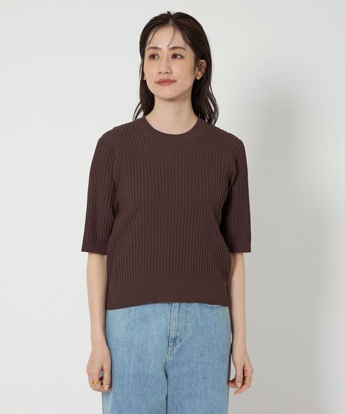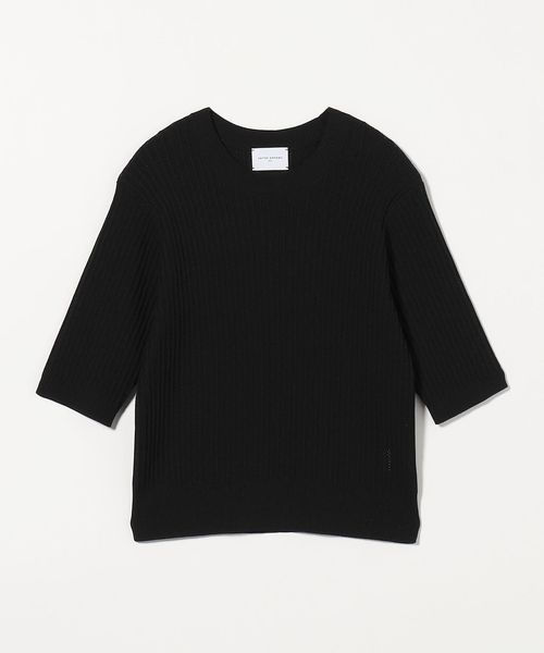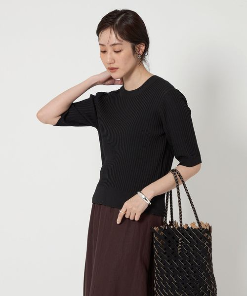 太めのリブの襟ぐり、すっきりとやや長めのハーフスリーブの袖がポイント。