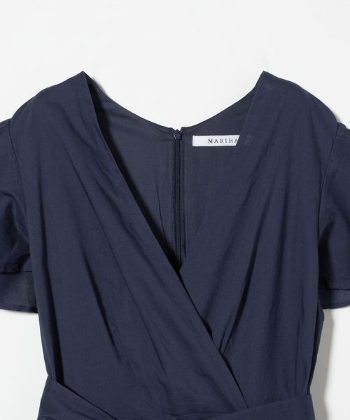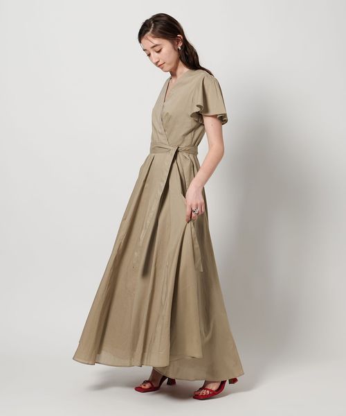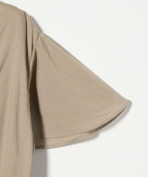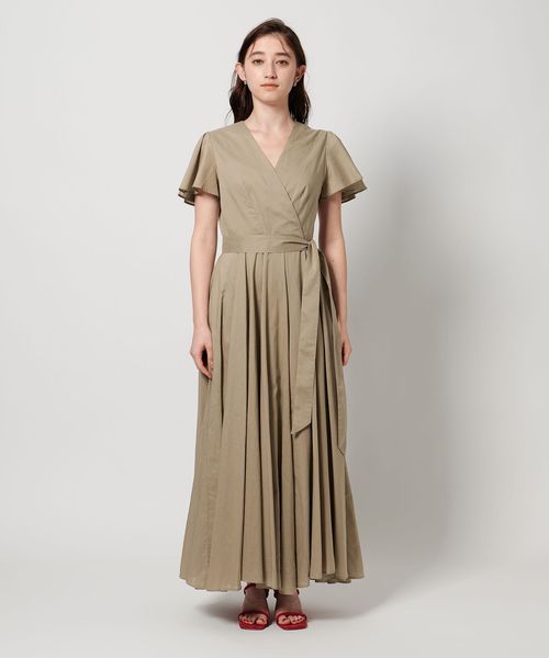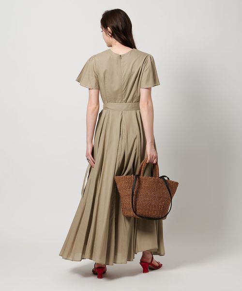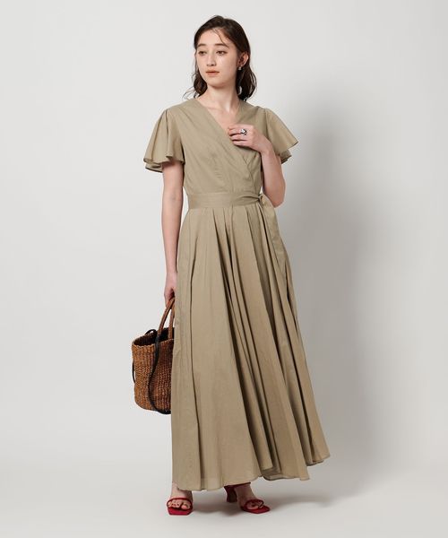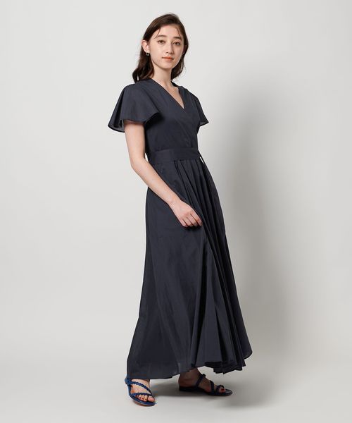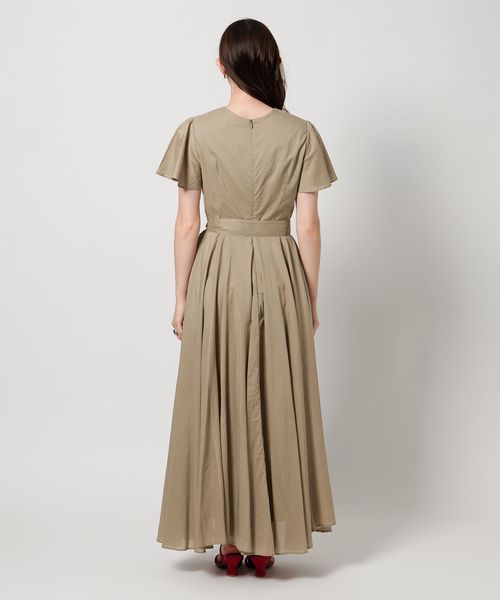 肩と腕をさりげなくカバーするフレアスリーブに、程よくあいたデコルテが女性らしい印象。