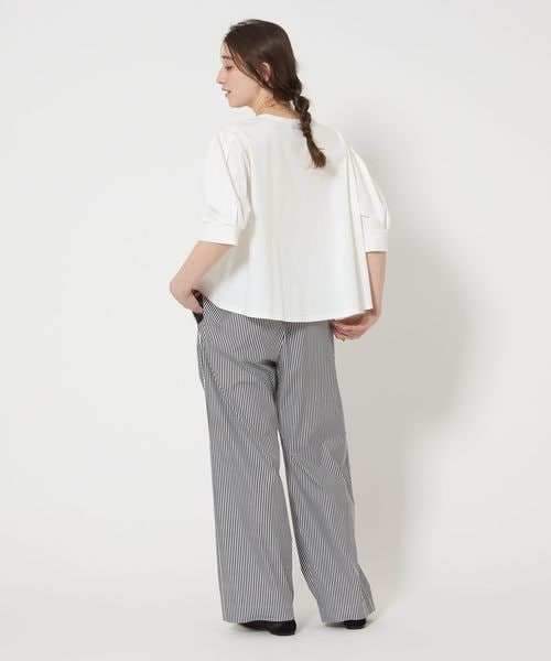 ハイウエストのボトムスとバランスの良いショート丈で、やや後ろ下がりになったニュアンスのあるシルエットです。