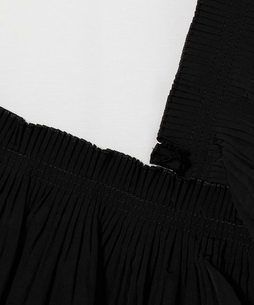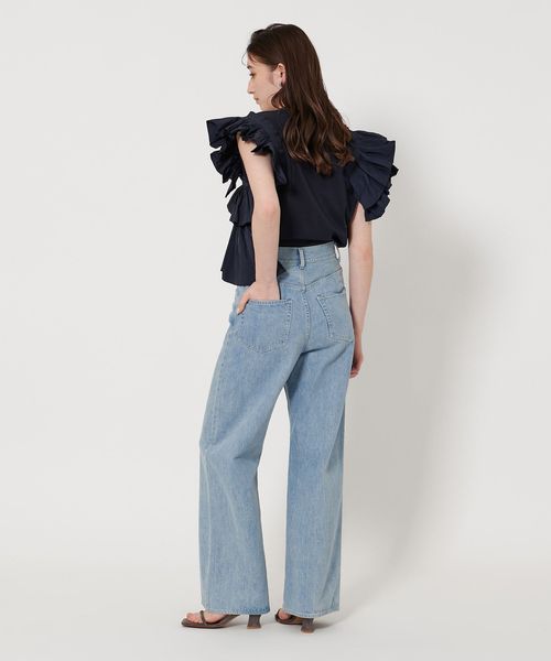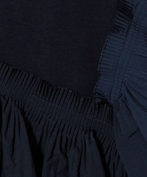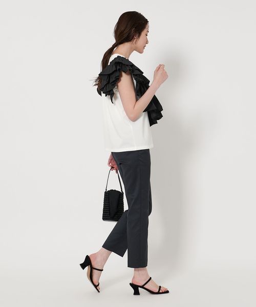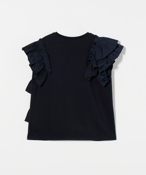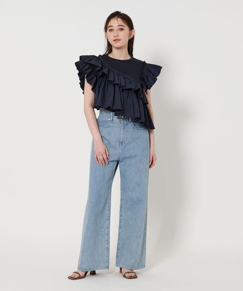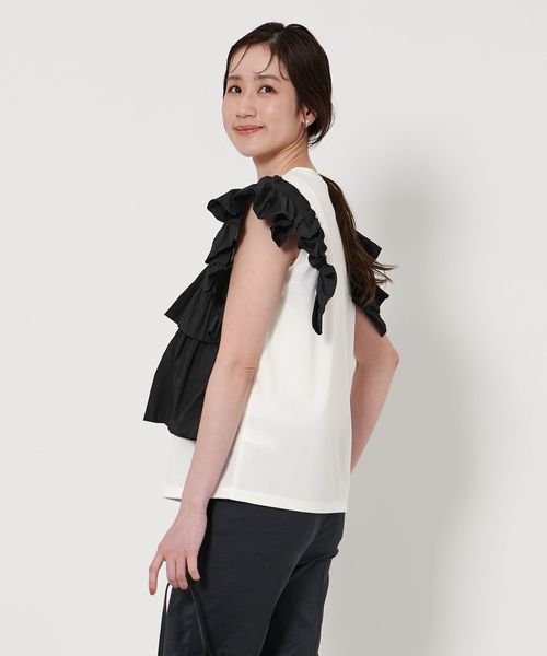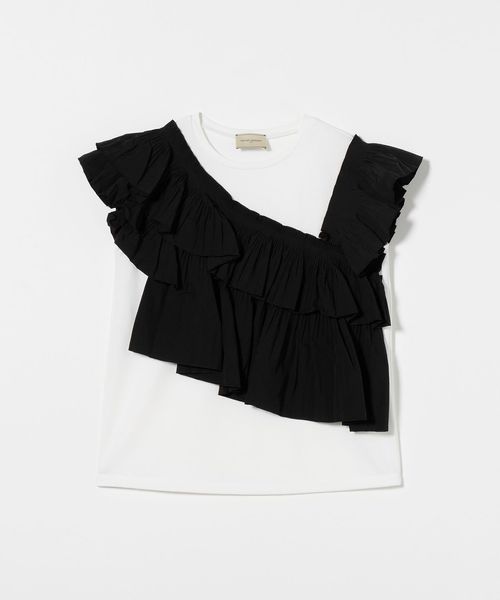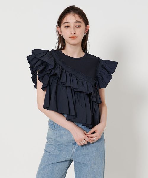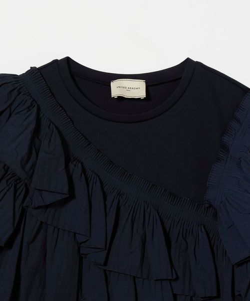 袖から見頃に続くアシンメトリーの大胆なプリーツフリルデザインが目を惹くカットソー。