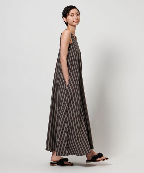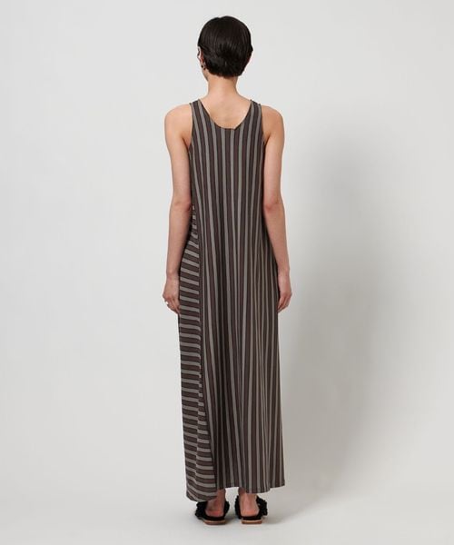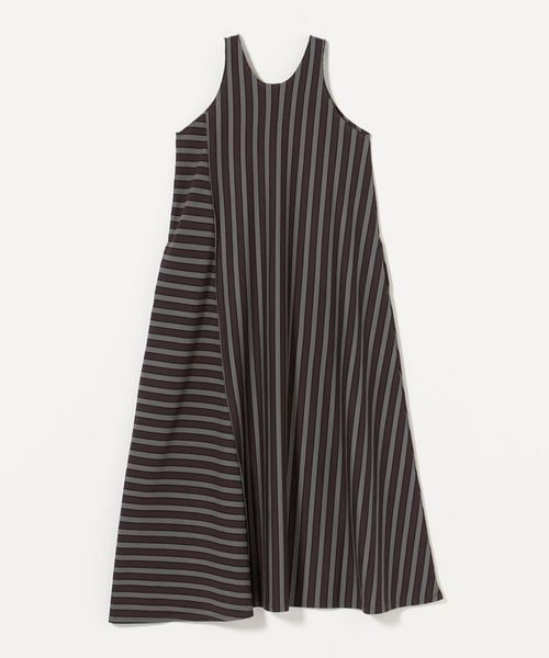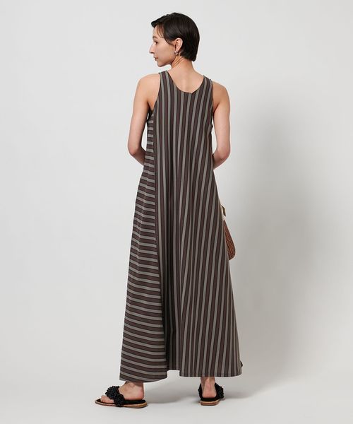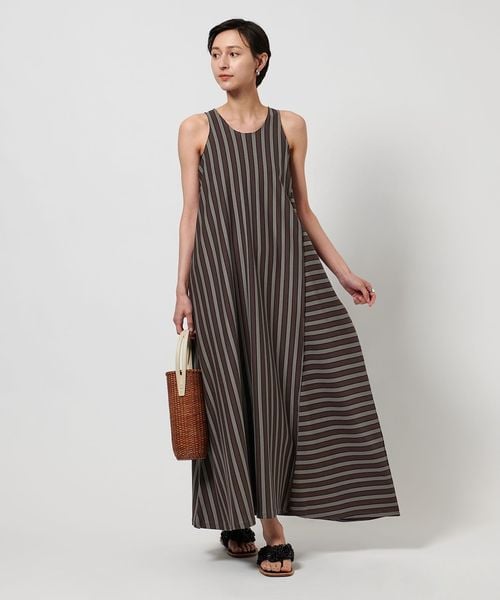 ストライプの生地を縦横で切り替えてアクセントをつけたマキシ丈ワンピース。