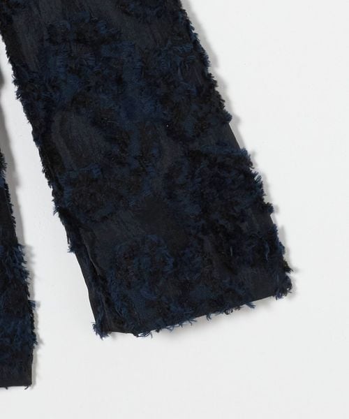 ナイロンと光沢のあるキュプラをベースに、綿とレーヨンでネイビーとブラックの2色を色分けして奥行き感を出したペイズリー柄のカットジャガード。