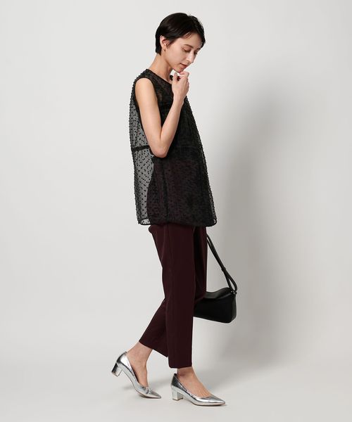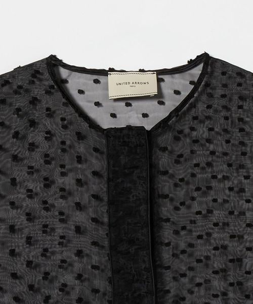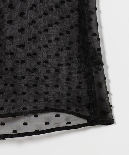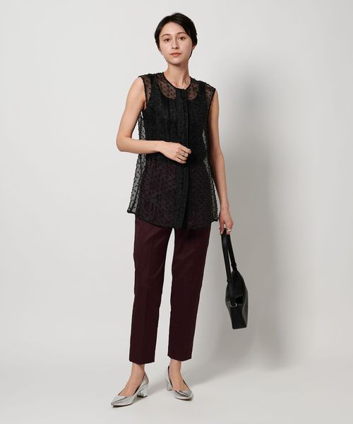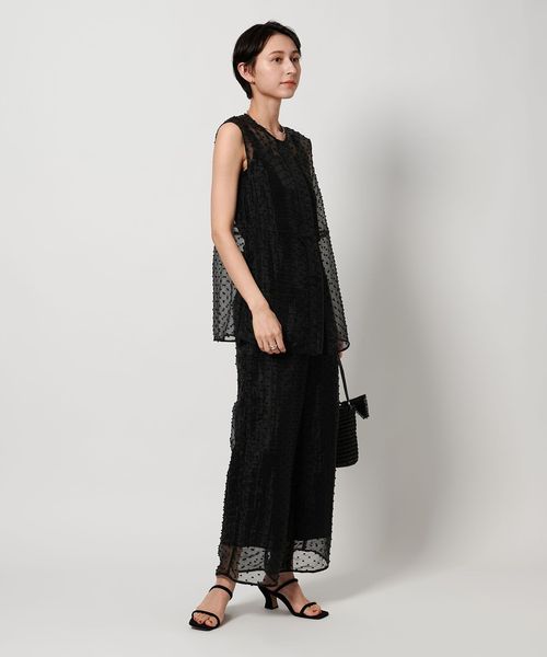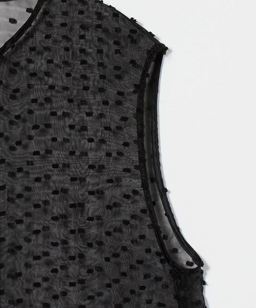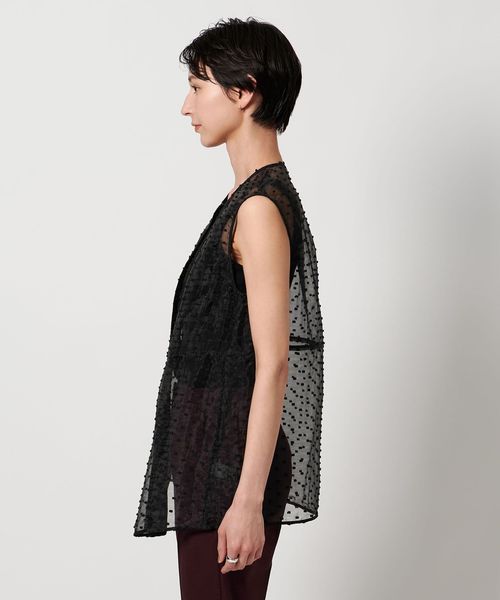 オーガンジー素材にドットジャガードが施された、上品な透け感の中にほんのりモード感が漂うベスト。