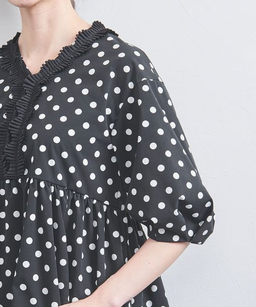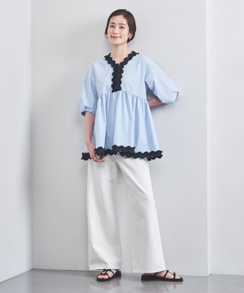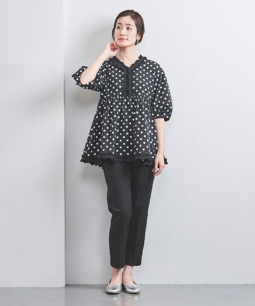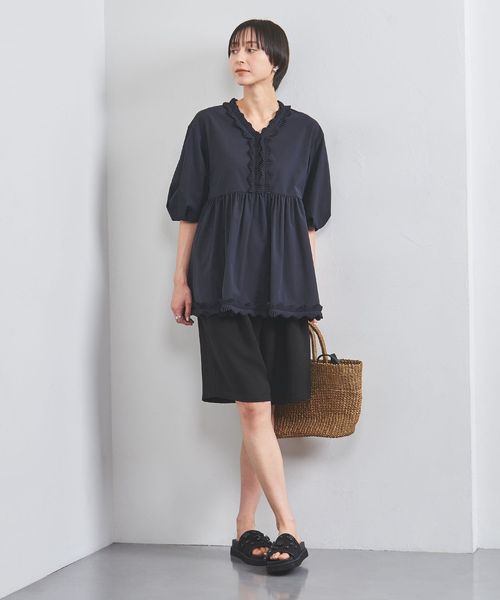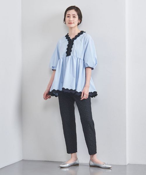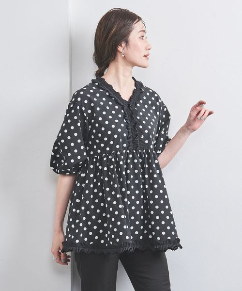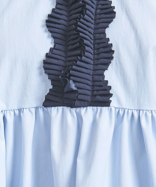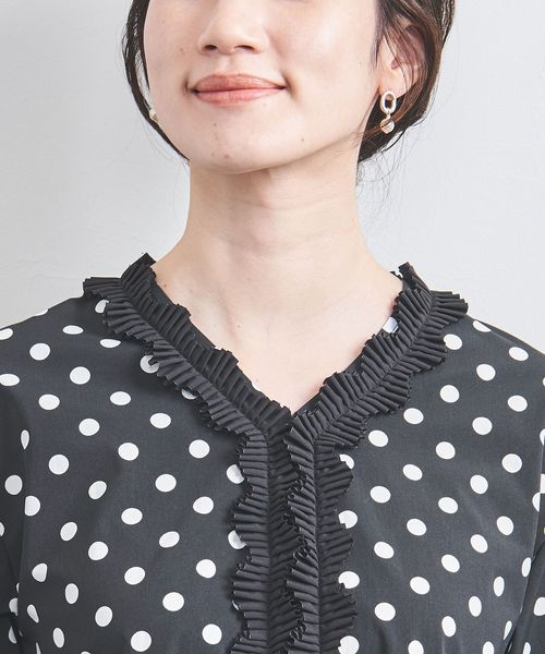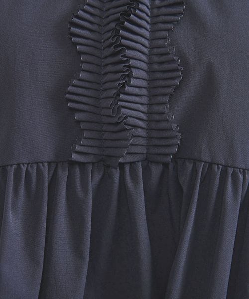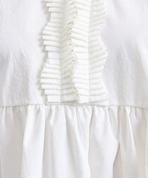 襟ぐりから前立て、裾に同素材のタックプリーツパーツをほどこした一枚で華やかな印象のブラウス。