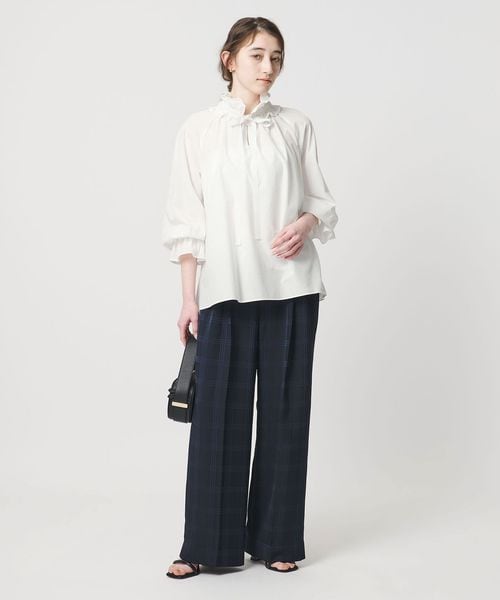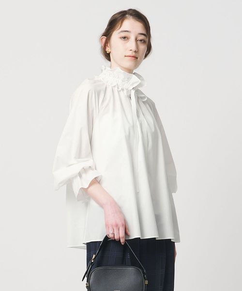 取り外し可能な共地のスタンドフリルの襟に、繊細なレースをあしらったギャザーフリルブラウス。
