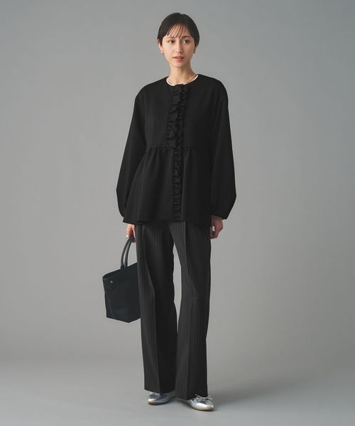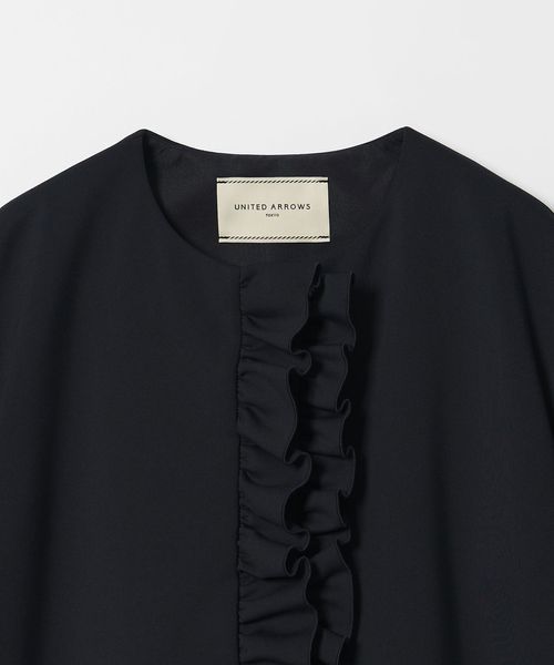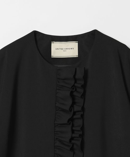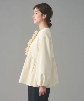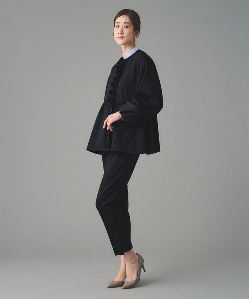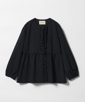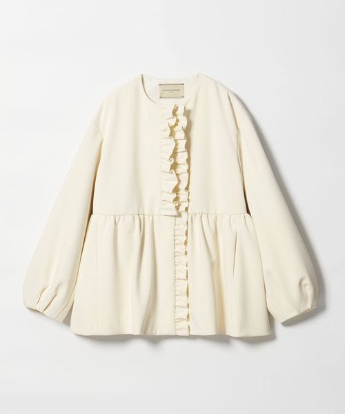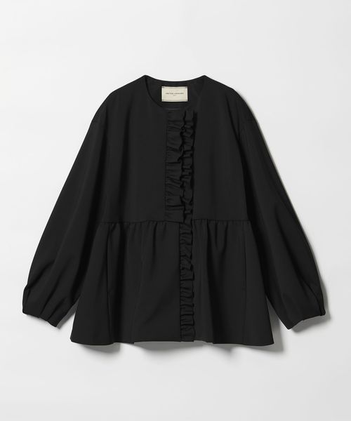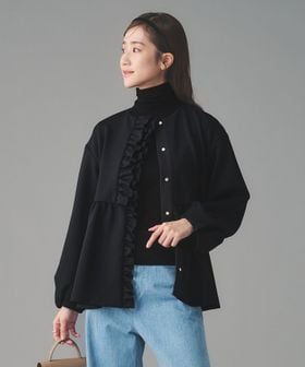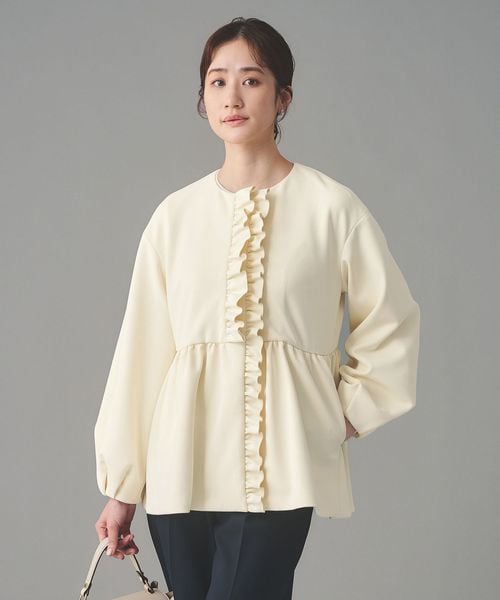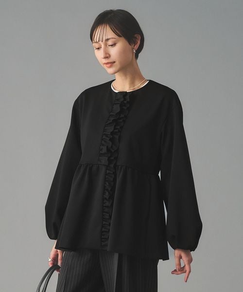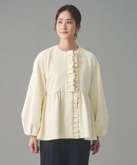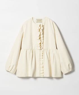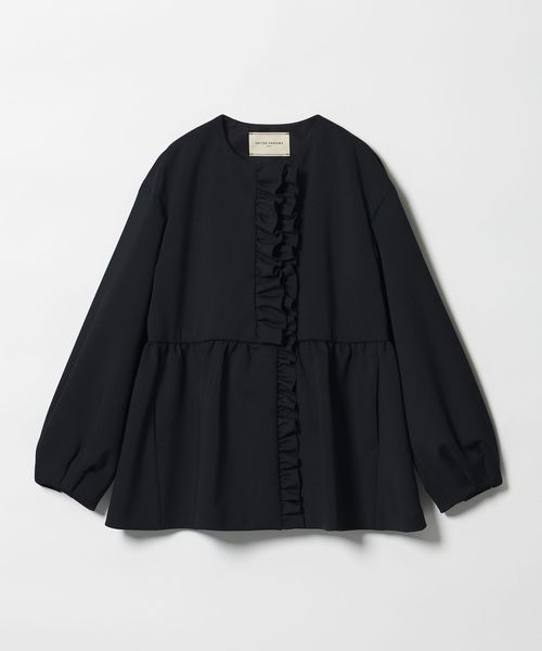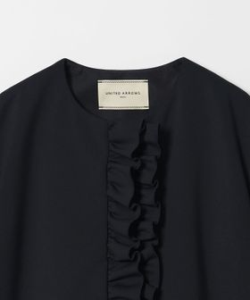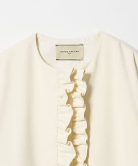 アシンメトリーにあしらったフロントのフリルが、動きのある表情を生み出すノーカラージャケット。