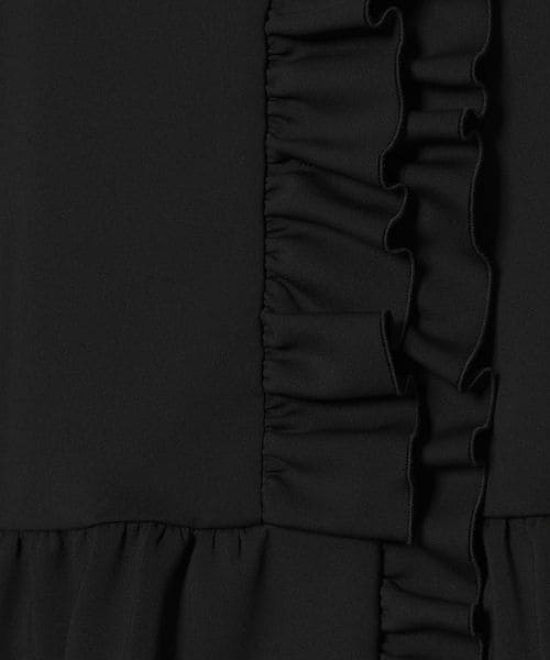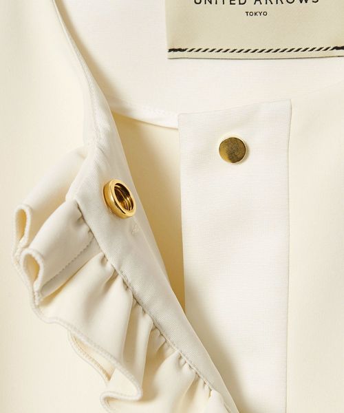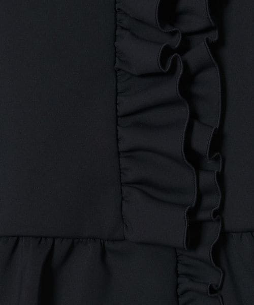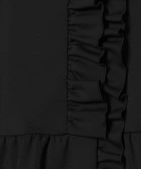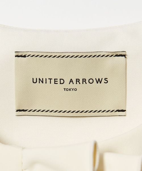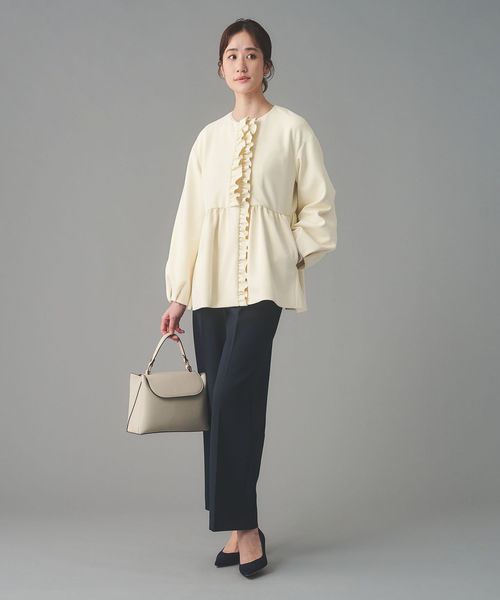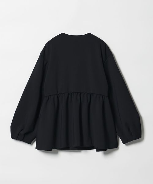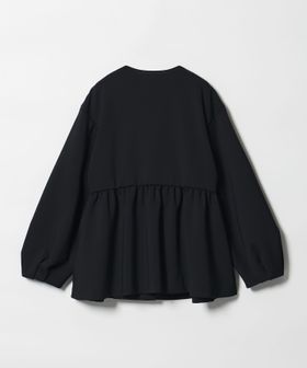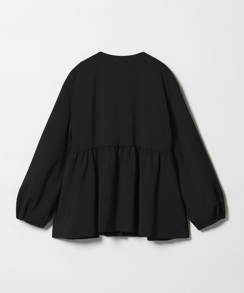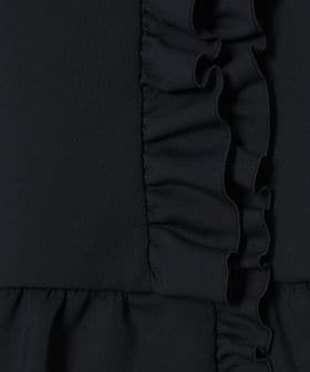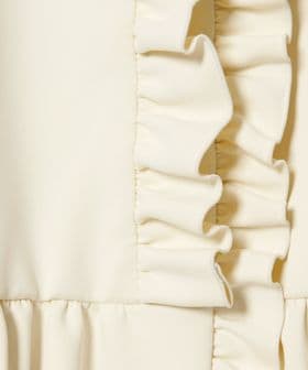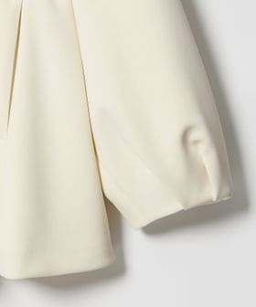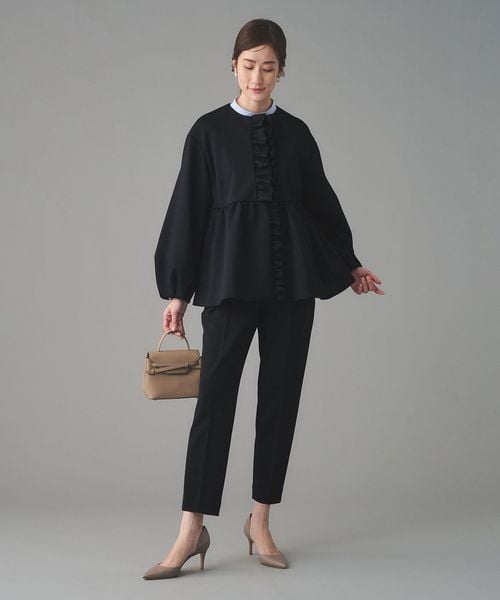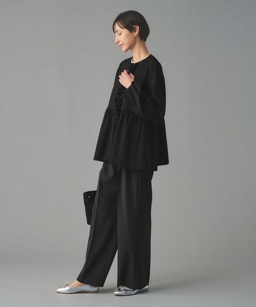 アシンメトリーにあしらったフロントのフリルが、動きのある表情を生み出すノーカラージャケット。