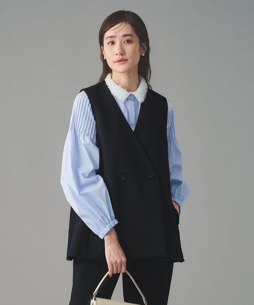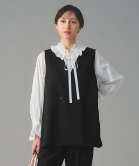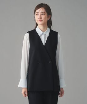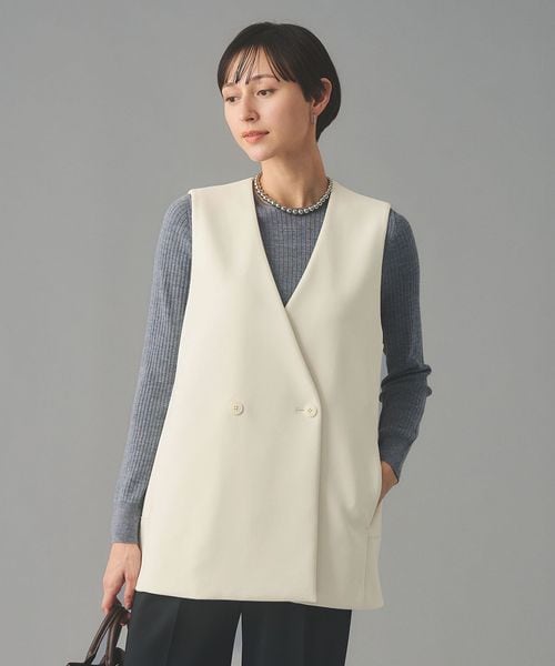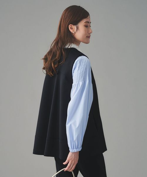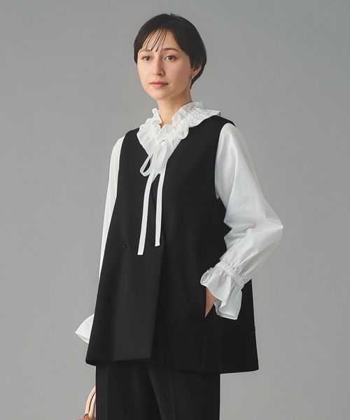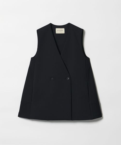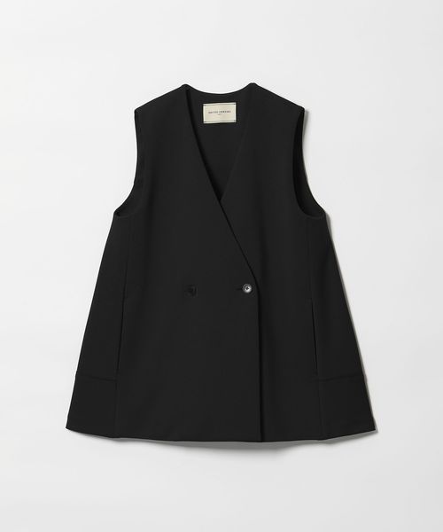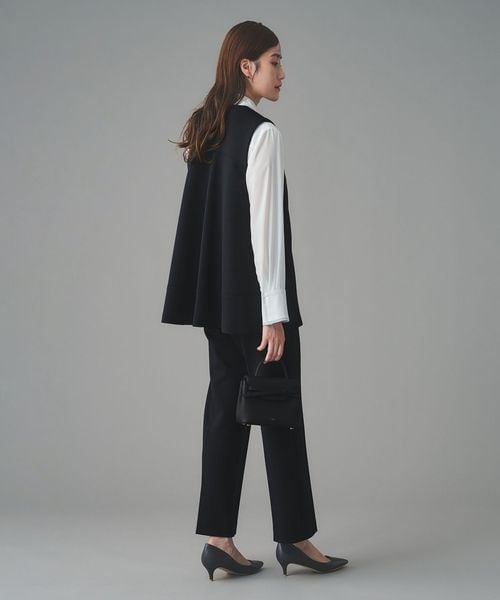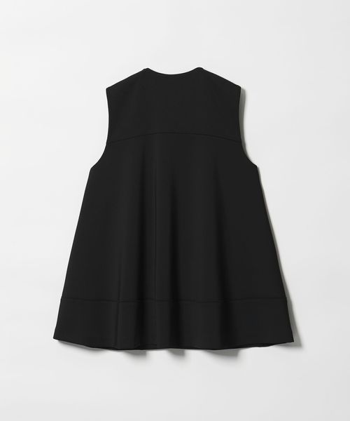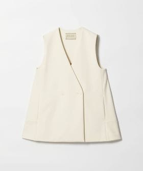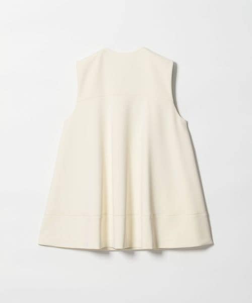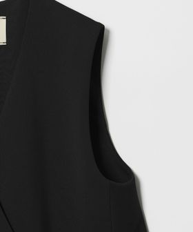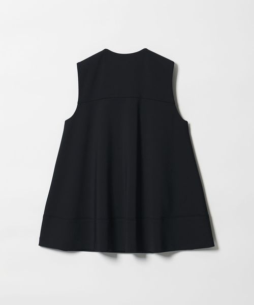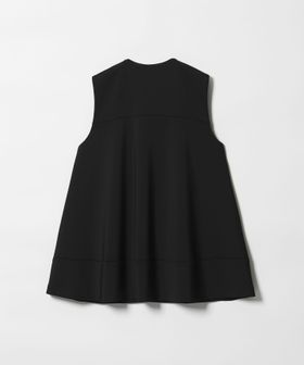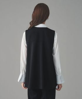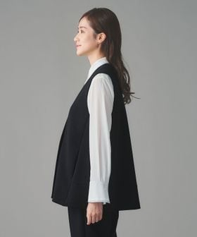 素材の特性を活かした立体的なバックフレアディテールが、女性らしい印象のノーカラーベスト。