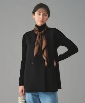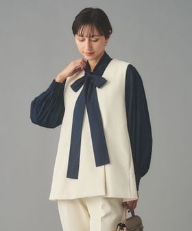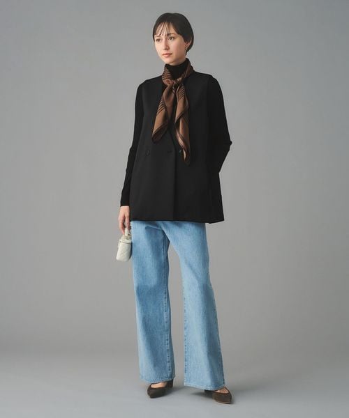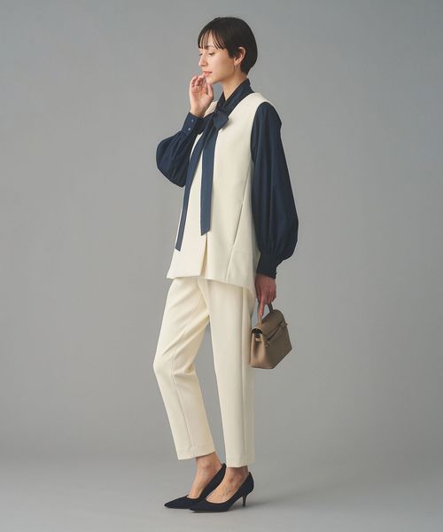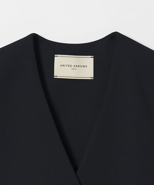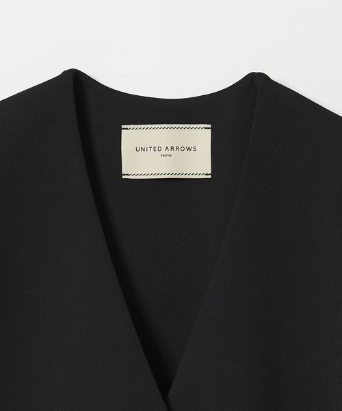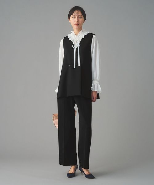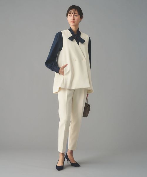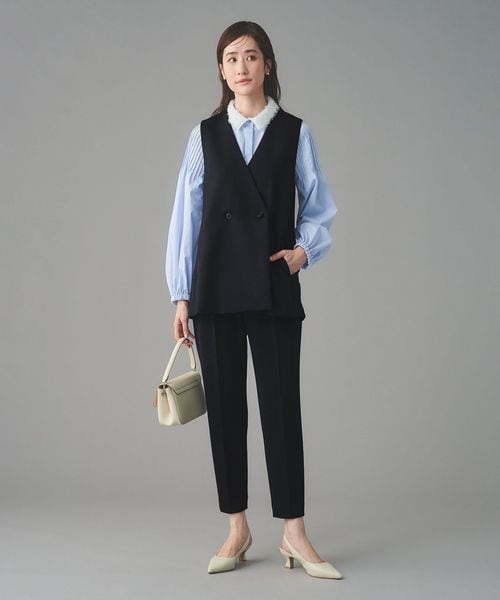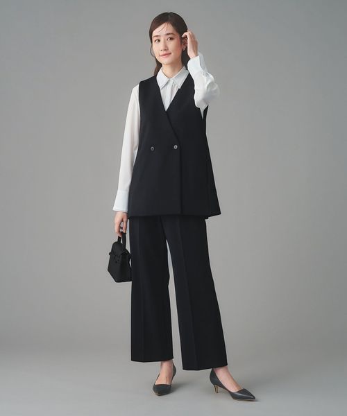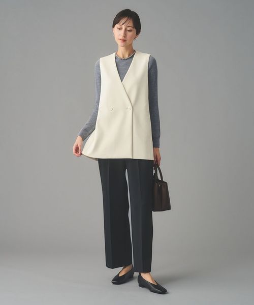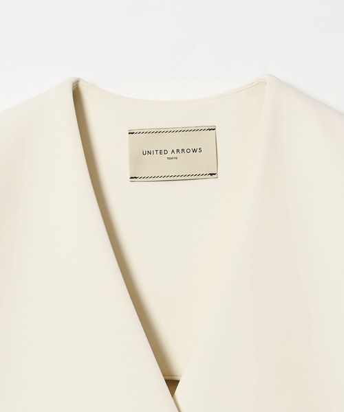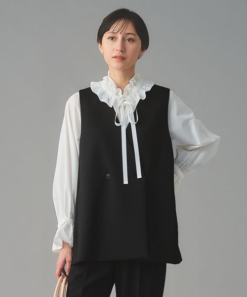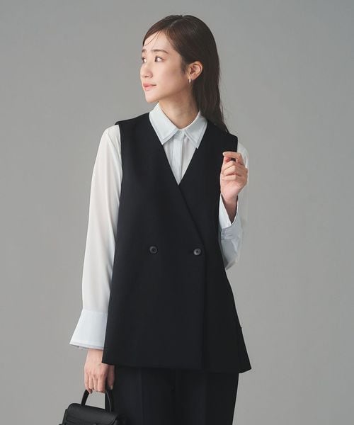 素材の特性を活かした立体的なバックフレアディテールが、女性らしい印象のノーカラーベスト。