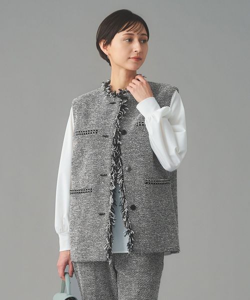 異素材のブレードと共地フリンジが華やかさを添えるベスト。