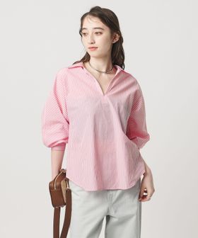 キーネックのすっきりとした襟元に、繊細なギャザーとたっぷりとした生地感が映える立体的なシルエットのシャツブラウス。