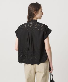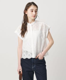 身頃にレースをあしらったフレンチスリーブのシャツブラウス。
