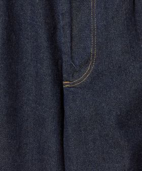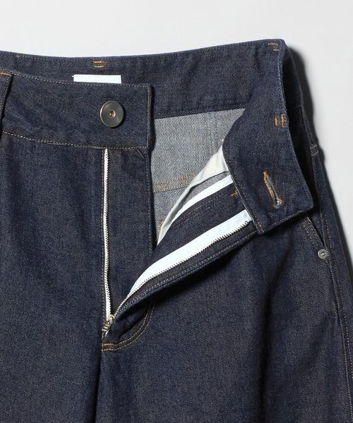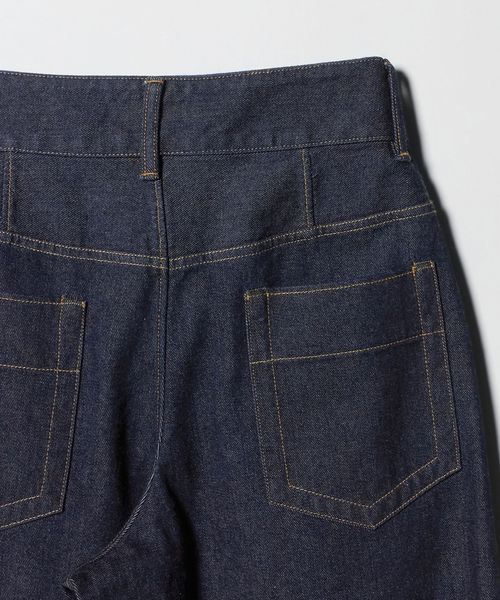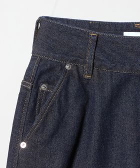 ウエストはカーブ仕様、背面にはバックヨークの切り替えとダーツを入れ、デニムらしい表情を残しつつも、スラックスのパターンメイキングで仕立てた一着です。