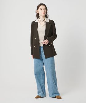 低めの前合わせと縦長のラペルで、胸元に抜け感をプラスし、すっきりとした印象に仕上げました。