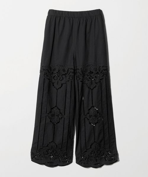 ほんのり透け感のあるフラワーモチーフのコットンレース生地で仕立てたパンツ。