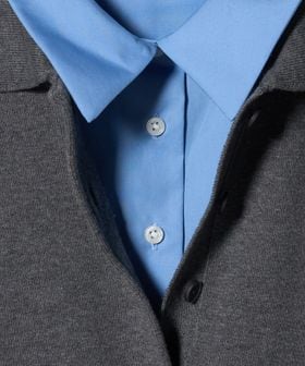 胸元まであるシャツ襟パーツは、首元の開きを好みに合わせて調整できるのも嬉しいポイント。