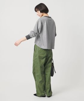 配色リブのデザインや、後ろ下がりの立体的なシルエットが魅力の箔プリントのスウェット。