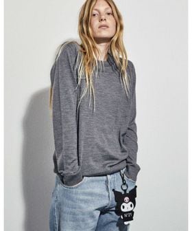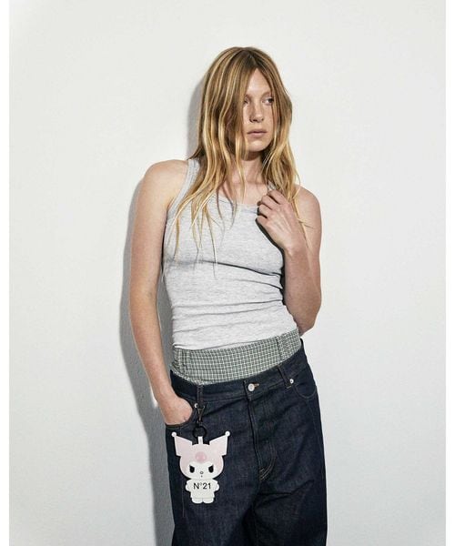 N21のロゴTシャツを着たKUROMIを、しなやかで艶のある素材にプリント。