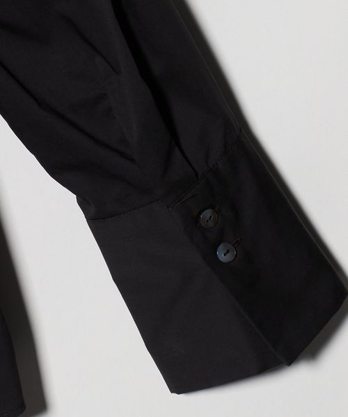 構築的なプリーツやタックのディテールに、シャープなシャツ袖を組み合わせることで、洗練されたモードな雰囲気を演出。