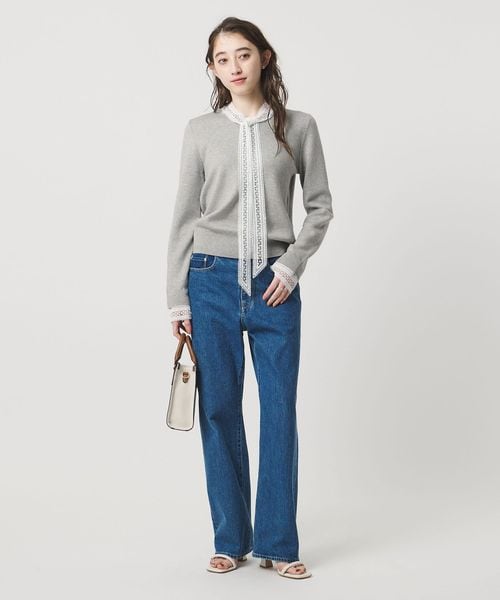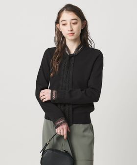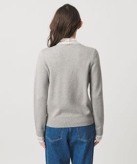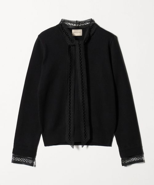 襟と袖口に取り外し可能なケミカルレースをあしらったニット。
