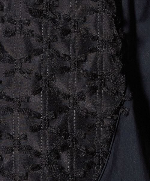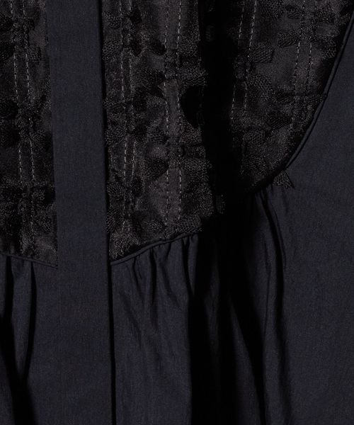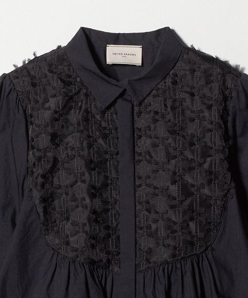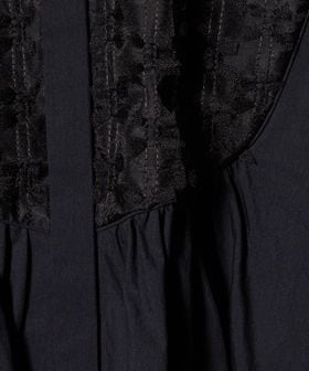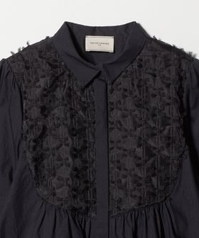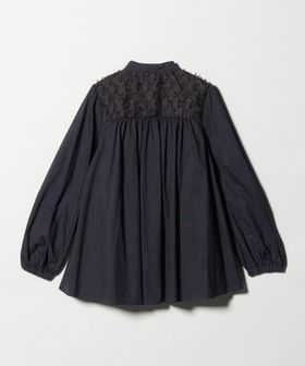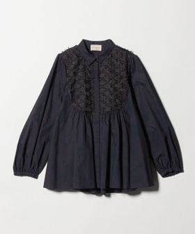ヨーク部分に華やかな刺繍素材をあしらい、切替から広がるギャザーで女性らしいシルエットを演出した長袖ブラウス。