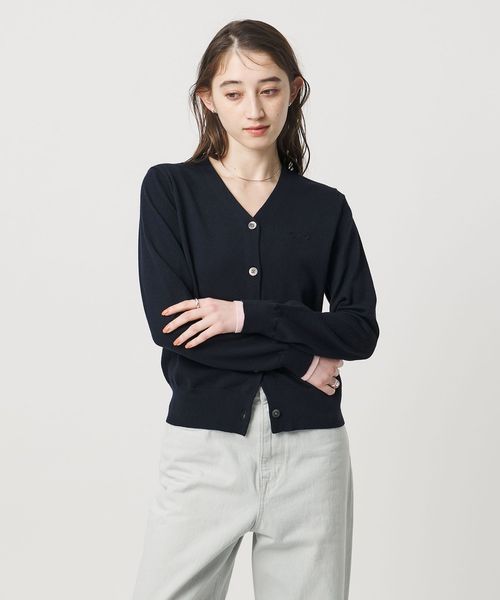 シンプルで着まわしやすいデザインながら、見返し仕立ての浅いVネックや、配色を効かせた二重仕立ての袖口、左胸にあしらった遊び心ある手刺繍など、細部にまで技が光る一枚です。