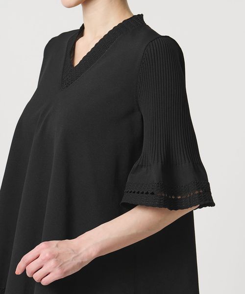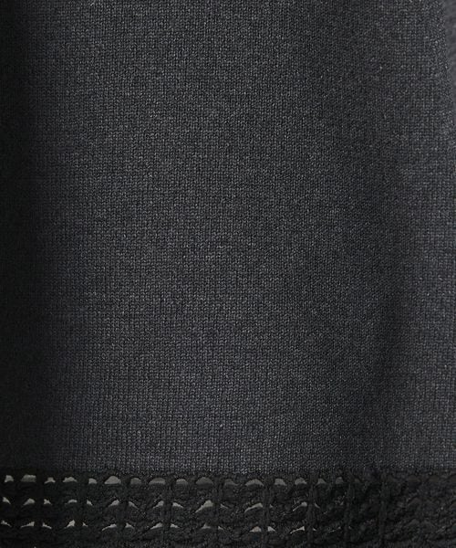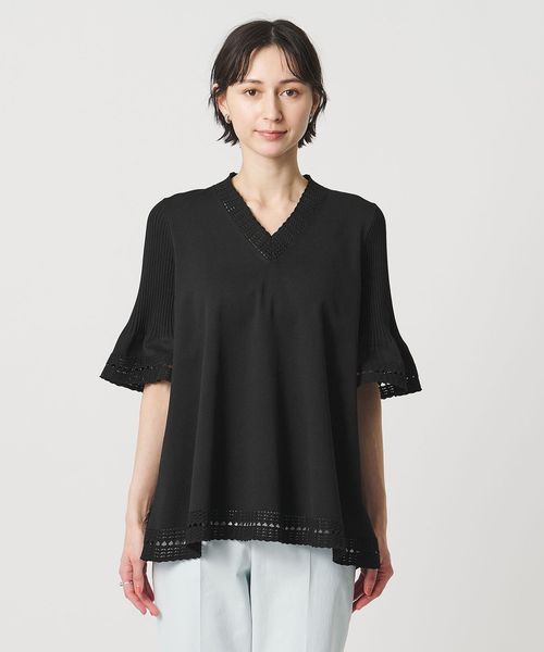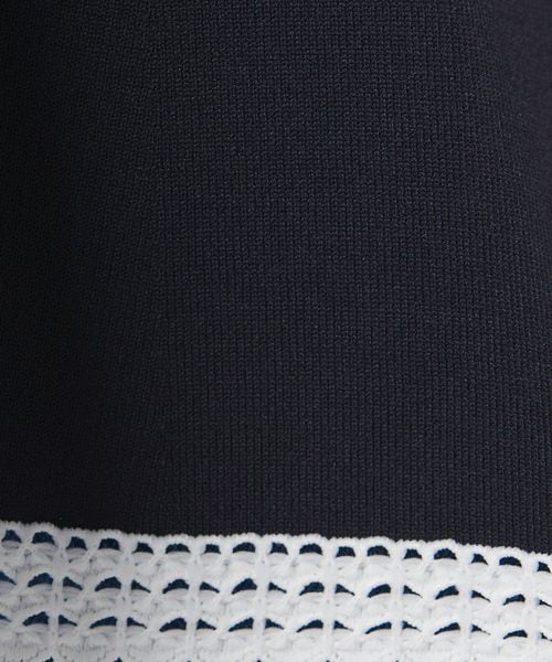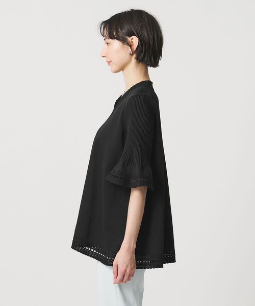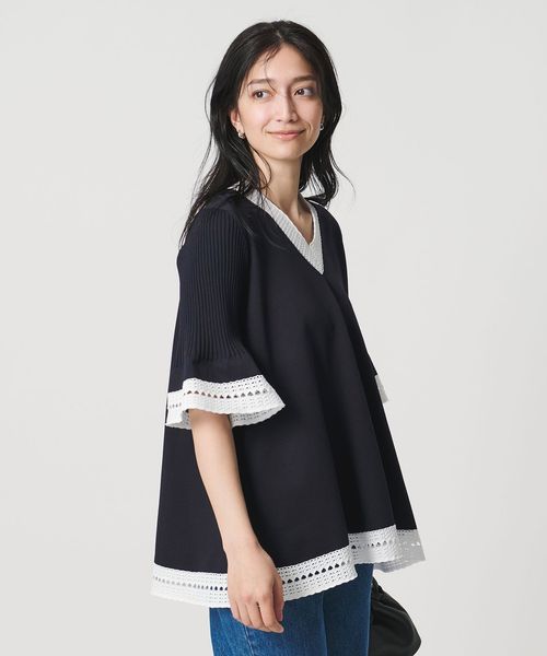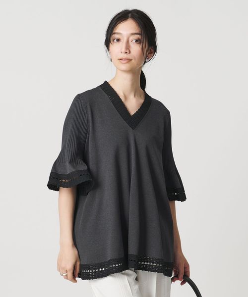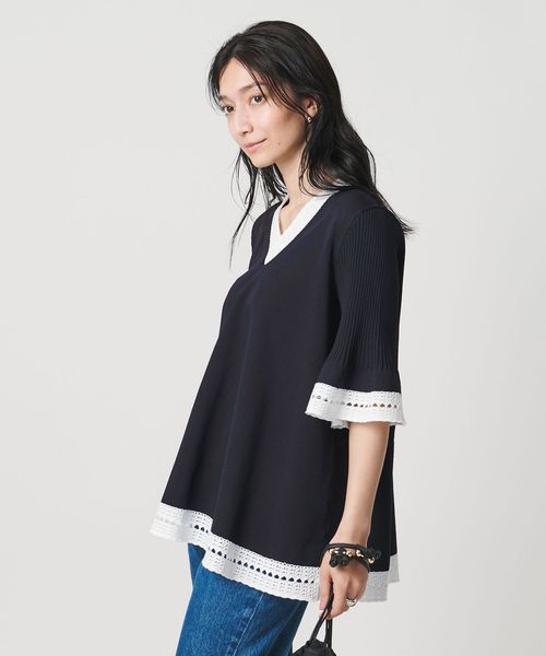 襟、袖口、裾周りに異なるゲージで編みたてた、鍵針風の柄をあしらったニットトップス。