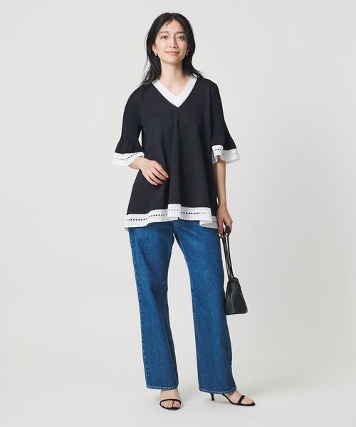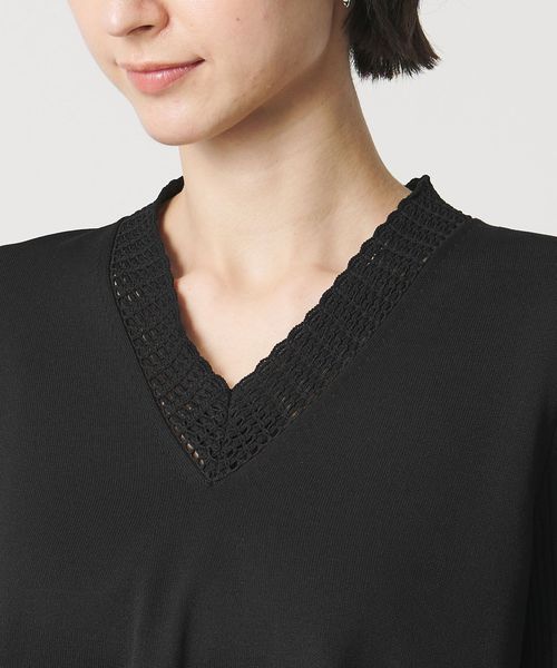 程よく開いたVネックがデコルテを美しく、顔周りをすっきりと見せてくれます。