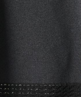 襟、袖口、裾周りに異なるゲージで編みたてた、鍵針風の柄をあしらったニットトップス。