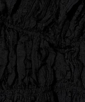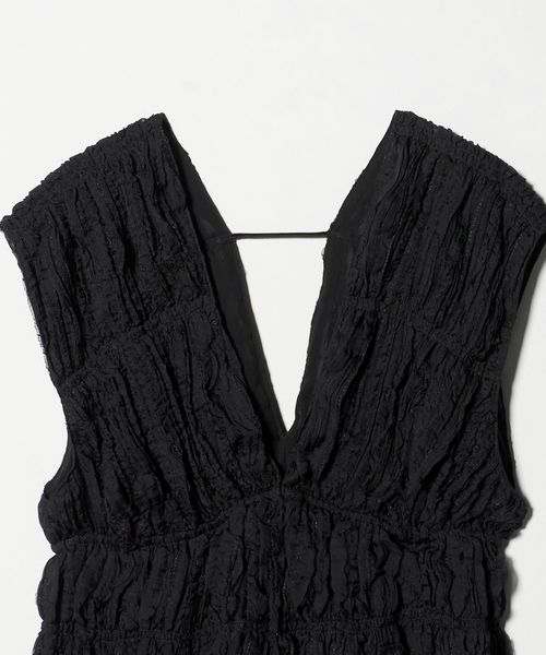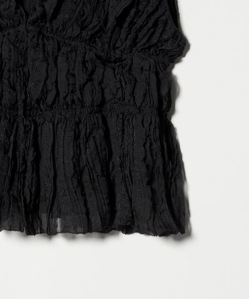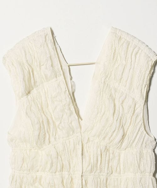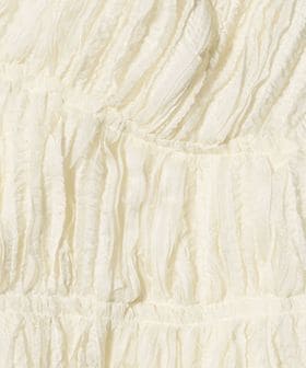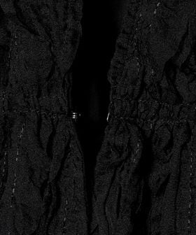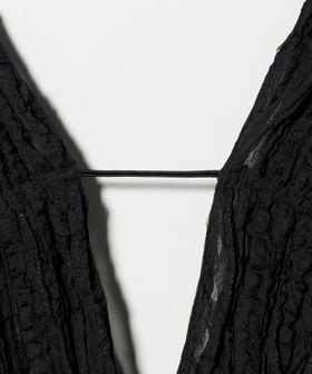 二枚重ねた生地にタテステッチを入れ、一枚をステッチに沿ってカットした後、ランダムプリーツを施した独自の表情が魅力です。