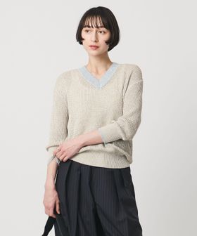 首元が出すぎない程よい太さのVネックがポイントの八分袖プルオーバーニット。