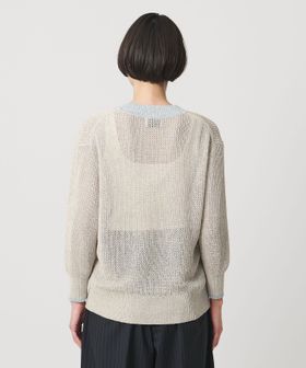 襟ぐりと袖口には、ボディより細番手で撚糸した糸を使用し、さりげない配色がアクセントになっています。