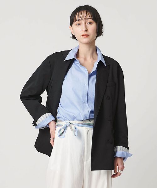 袖口を折り返して裏地のストライプをのぞかせると、スタイリングのアクセントに。