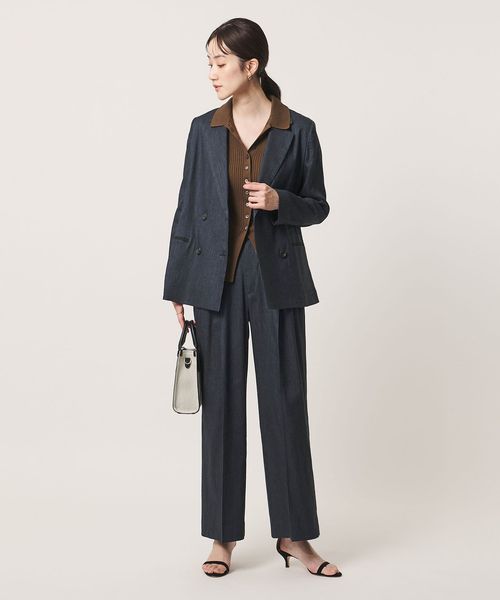 同素材のジャケットとのセットアップはもちろん、単品でもフィットシルエットのニットやカットソーと好相性で、幅広いスタイリングに活躍します。