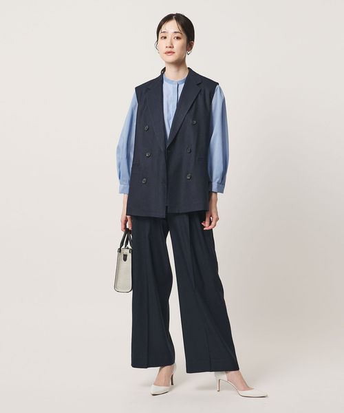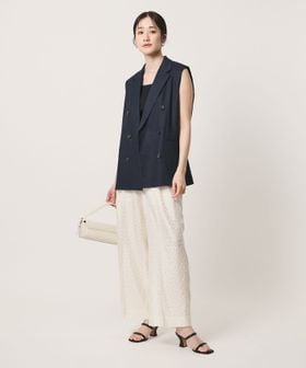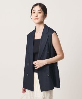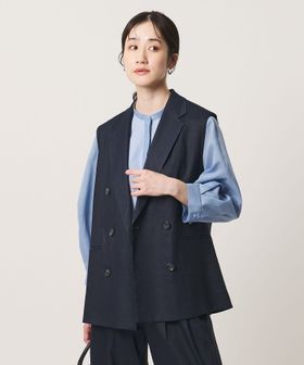 薄手の肩パッドとテーラードカラー、ダブルブレストが特徴のミドル丈ベスト。