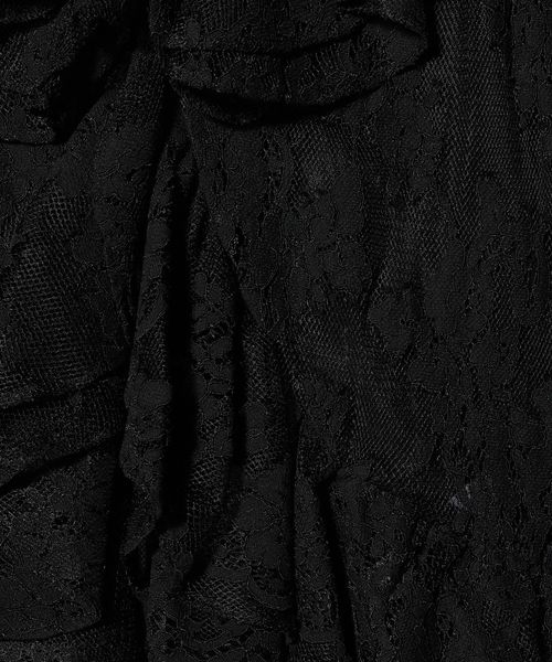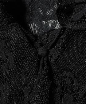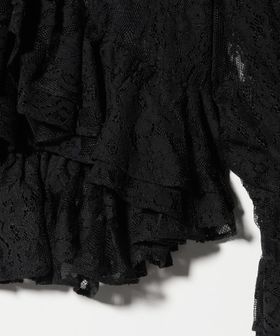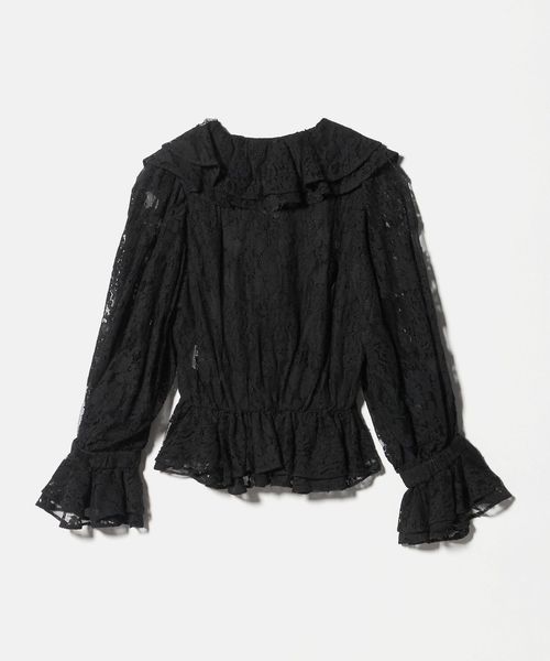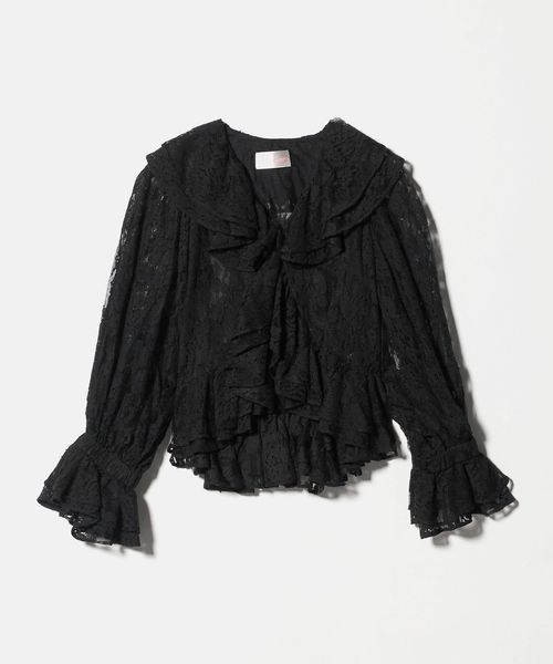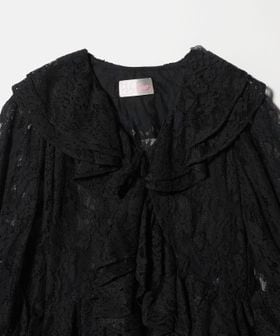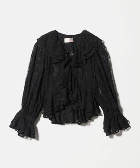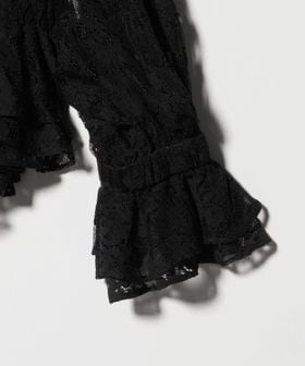 襟元や開き、袖口にたっぷりとレースをあしらい、繊細な陰影と美しいドレープが特徴のブラウス。